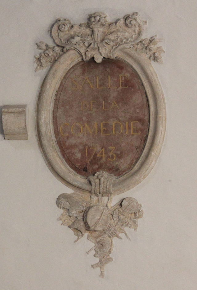 A gauche, médaillon central en pierre sculptée du grand portail de 1743 de la salle de la comédie.